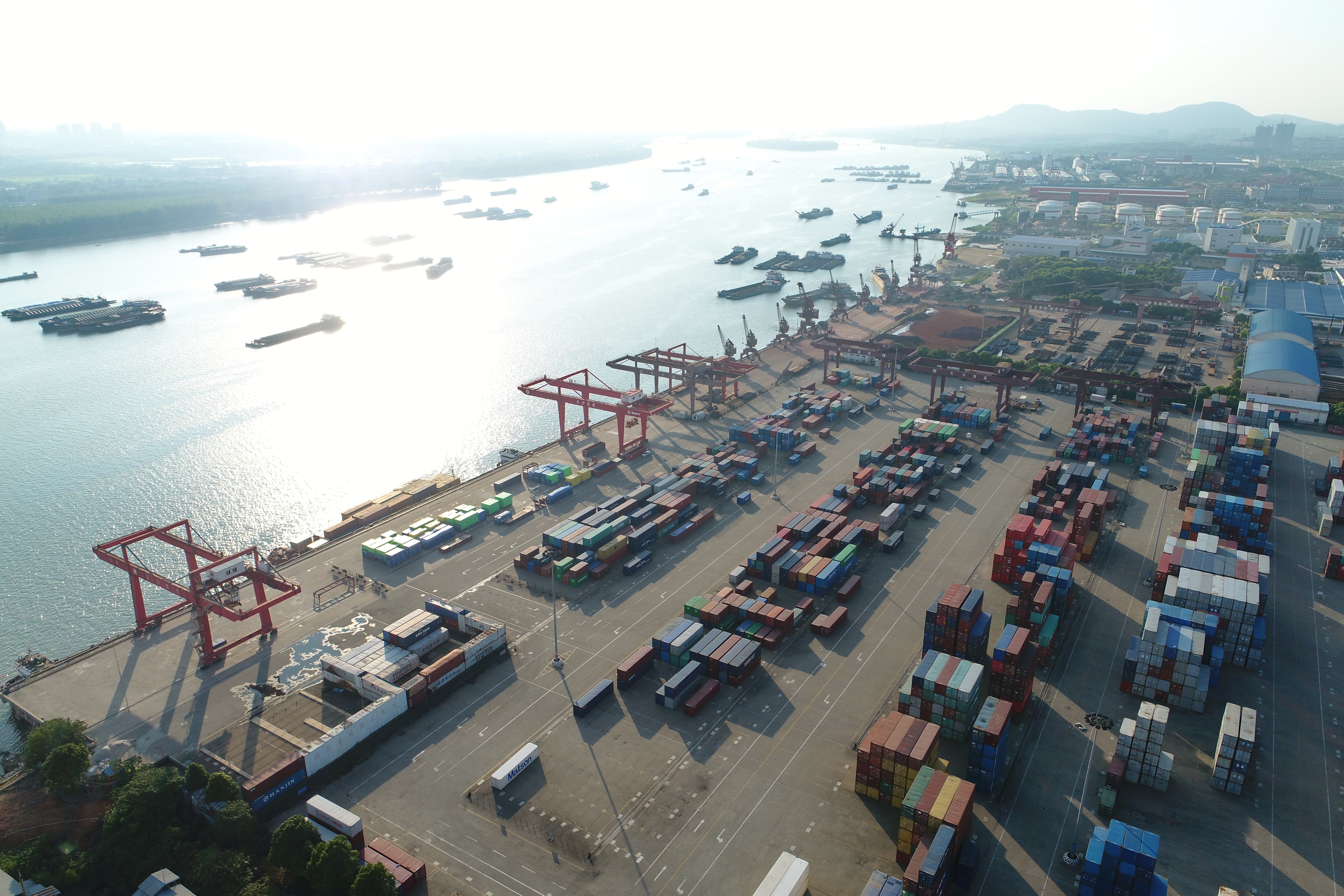 金秋9月,巨大貨輪停泊在長(cháng)沙城北的港口上,裝船機上下?lián)]舞臂膀,大型集裝箱鱗次櫛比,岸上吊車(chē)來(lái)回穿梭,一片繁忙景象…