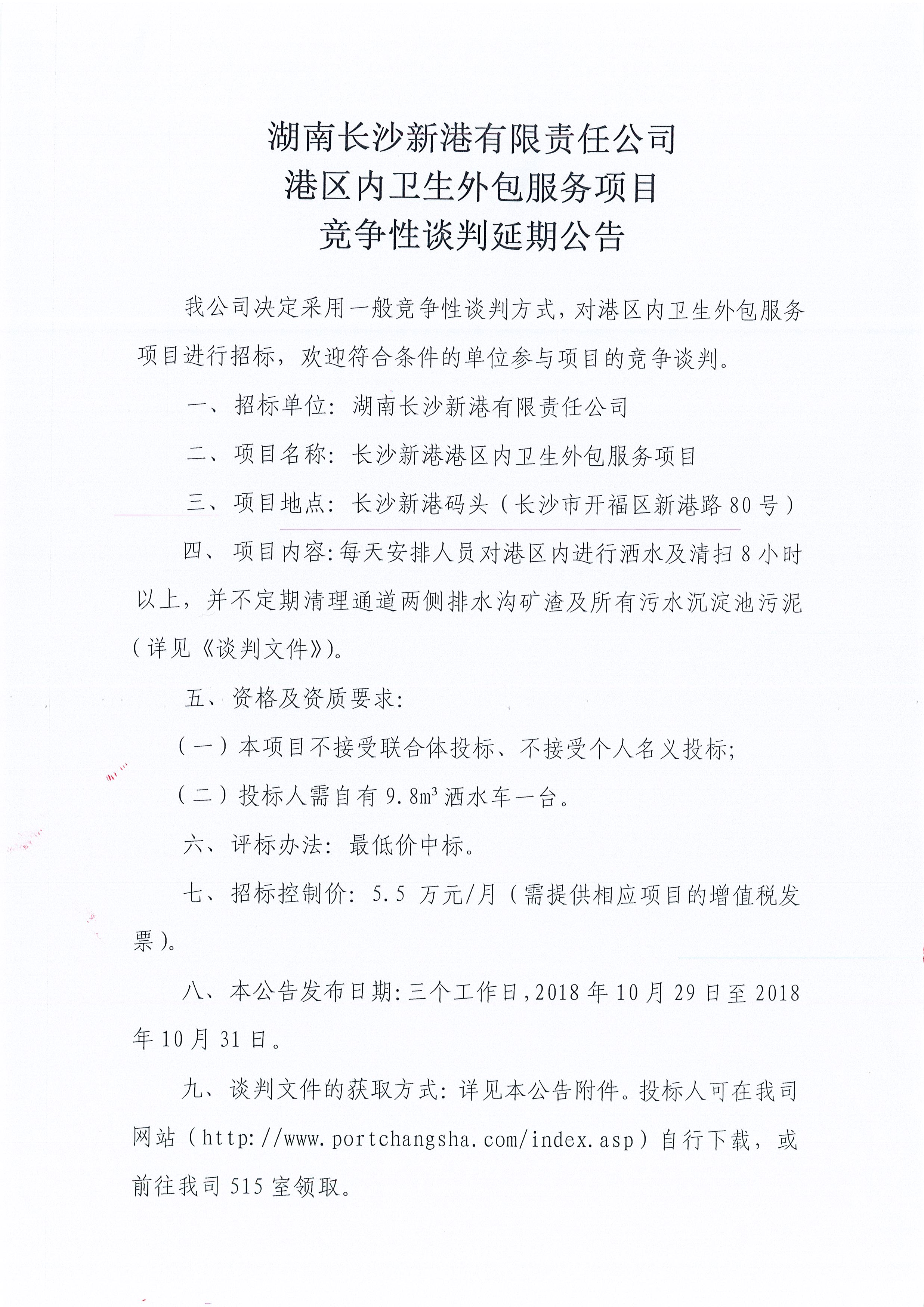 湖南長(cháng)沙新港有限責任公司港區內衛生外包服務(wù)項目競爭性談判延期公告