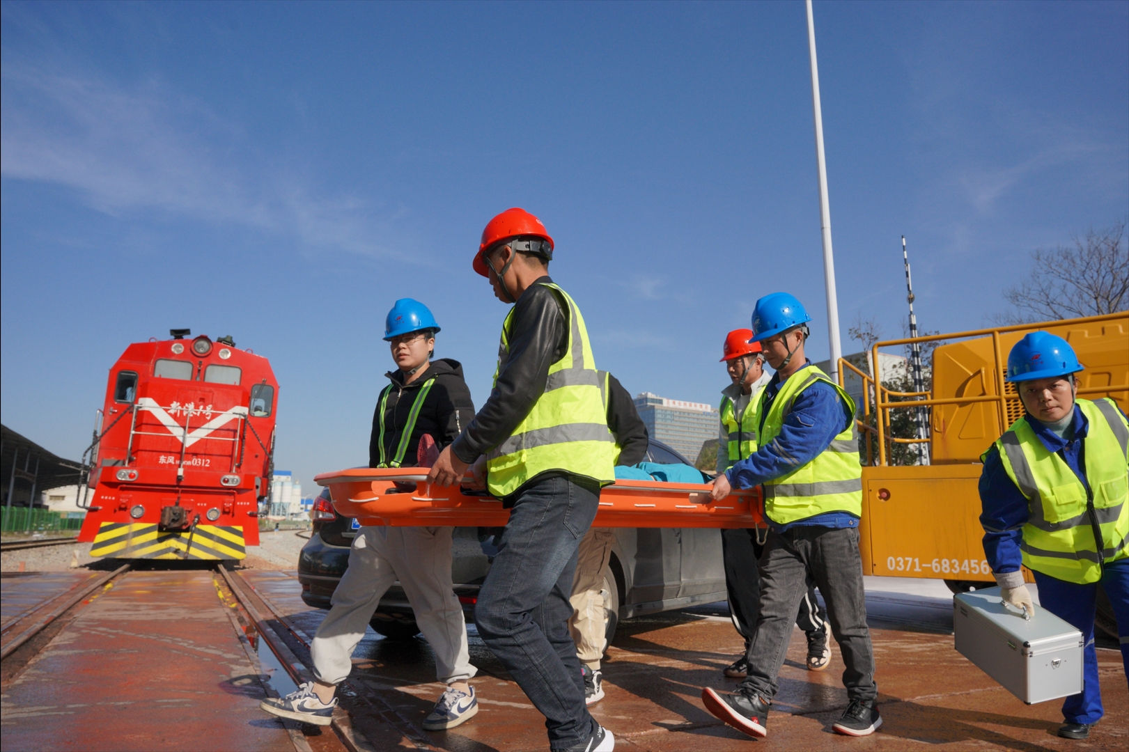 演練模擬長(cháng)沙新港專(zhuān)用鐵路列車(chē)上行經(jīng)過(guò)3號鐵路道口時(shí),與1輛沖卡搶道的機動(dòng)車(chē)發(fā)生碰撞,導致機動(dòng)車(chē)輛受損變形、起火、列車(chē)貨車(chē)車(chē)輛脫軌、人員受傷的應急處置。隨著(zhù)演練總指揮的一聲令下,演練正式開(kāi)始,公司安委辦接到事故報告后,按程序上報,公司主要負責人接報后立即宣布啟動(dòng)公司一級應急響應。道口值守員撥打120、122請求醫療救援和交通事故處理,各應急救援小組趕赴現場(chǎng)按程序搶險救援,并通報相關(guān)單位部室暫停、調整作業(yè)計劃,同時(shí)做好信息報送、發(fā)布和輿情管控工作。
