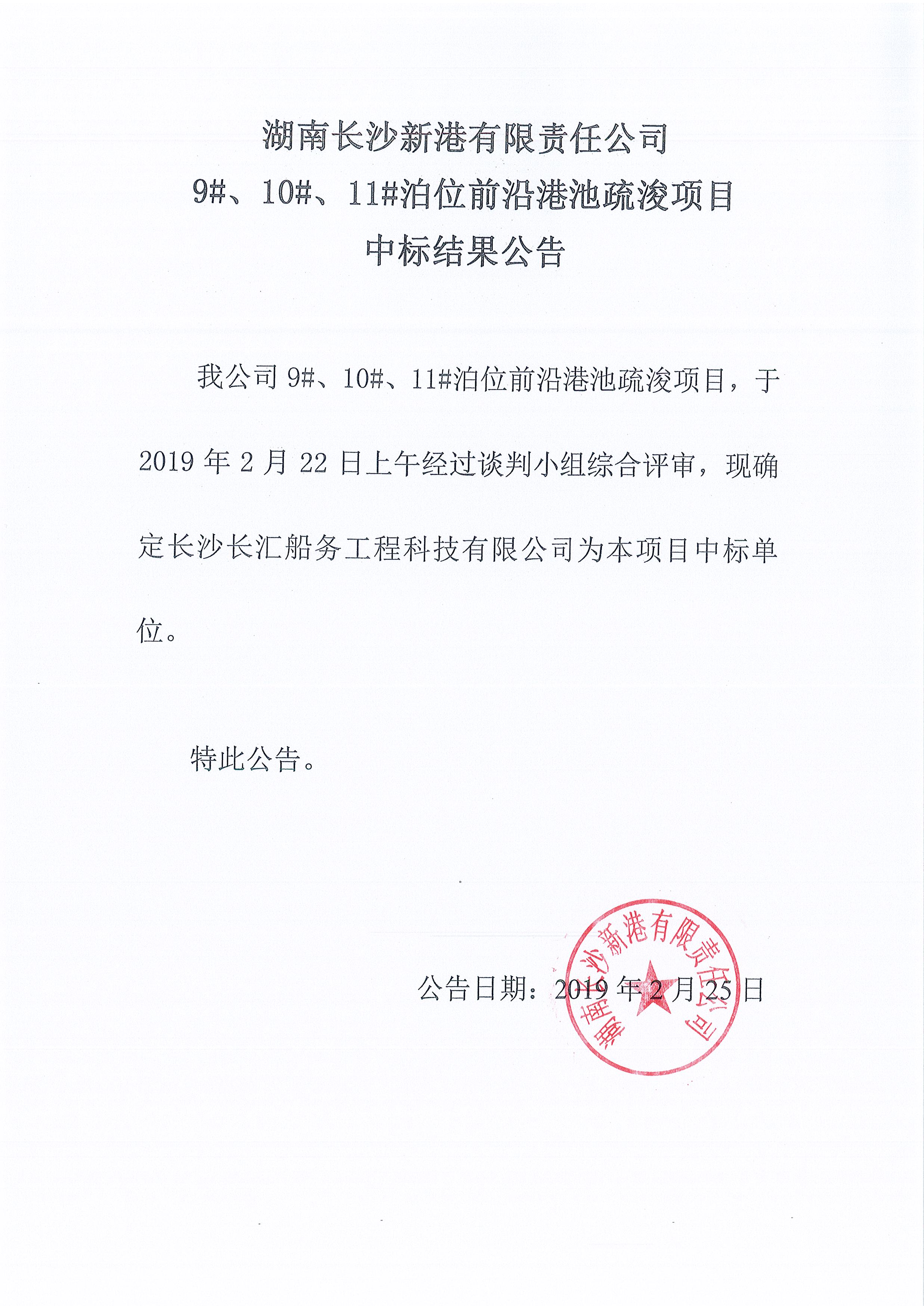 湖南長(cháng)沙新港有限責任公司 9#、10#、11#泊位前沿港池疏浚項目中標結果公告