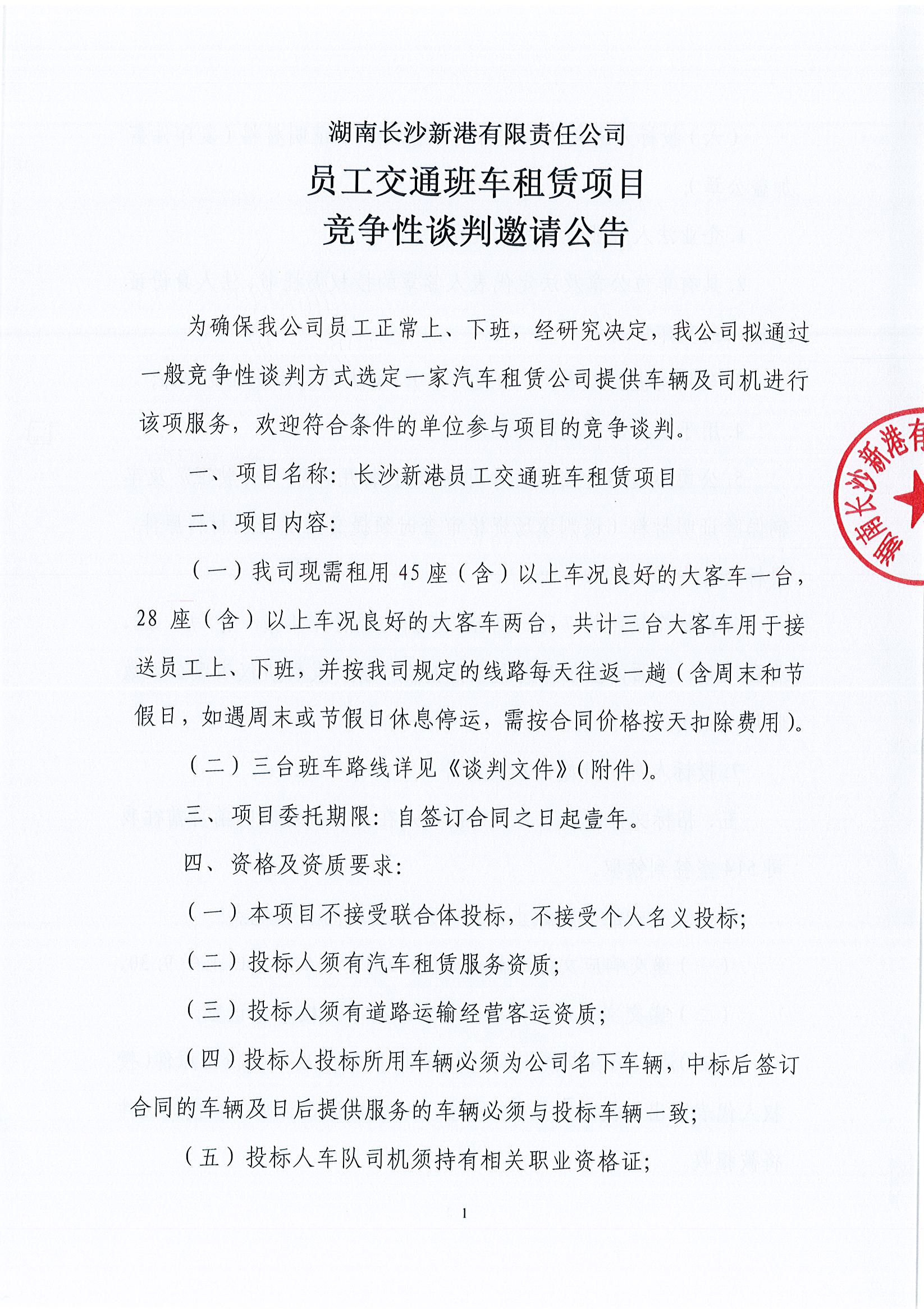 湖南長(cháng)沙新港有限責任公司員工交通班車(chē)租賃項目競爭性談判邀請公告