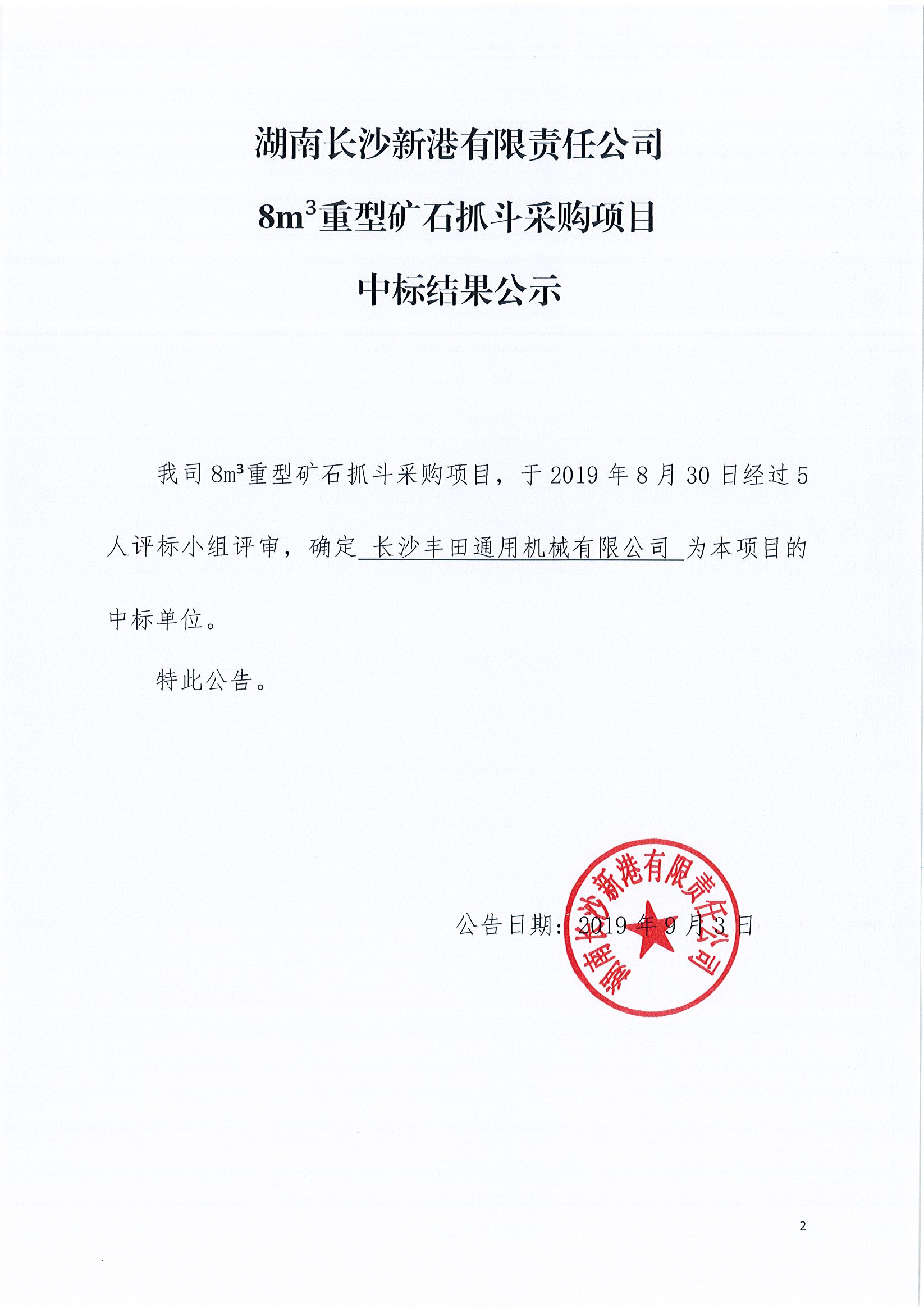 湖南長(cháng)沙新港有限責任公司8m³重型礦石抓斗采購項目中標結果公示