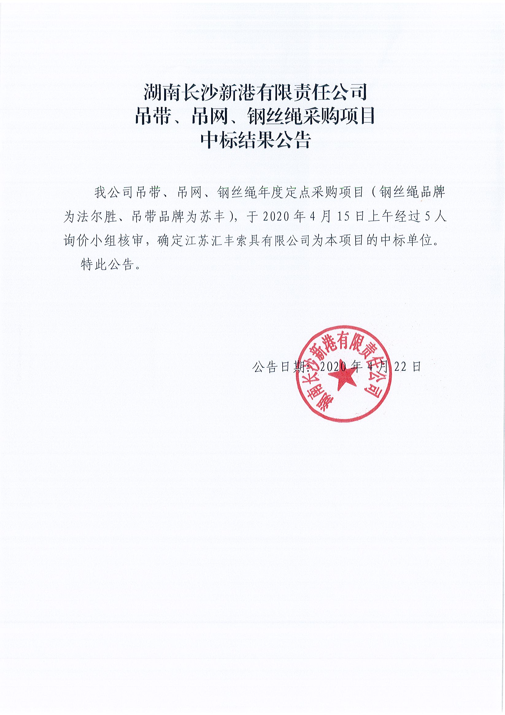 湖南長(cháng)沙新港有限責任公司吊帶、吊網(wǎng)、鋼絲繩采購項目中標結果公告