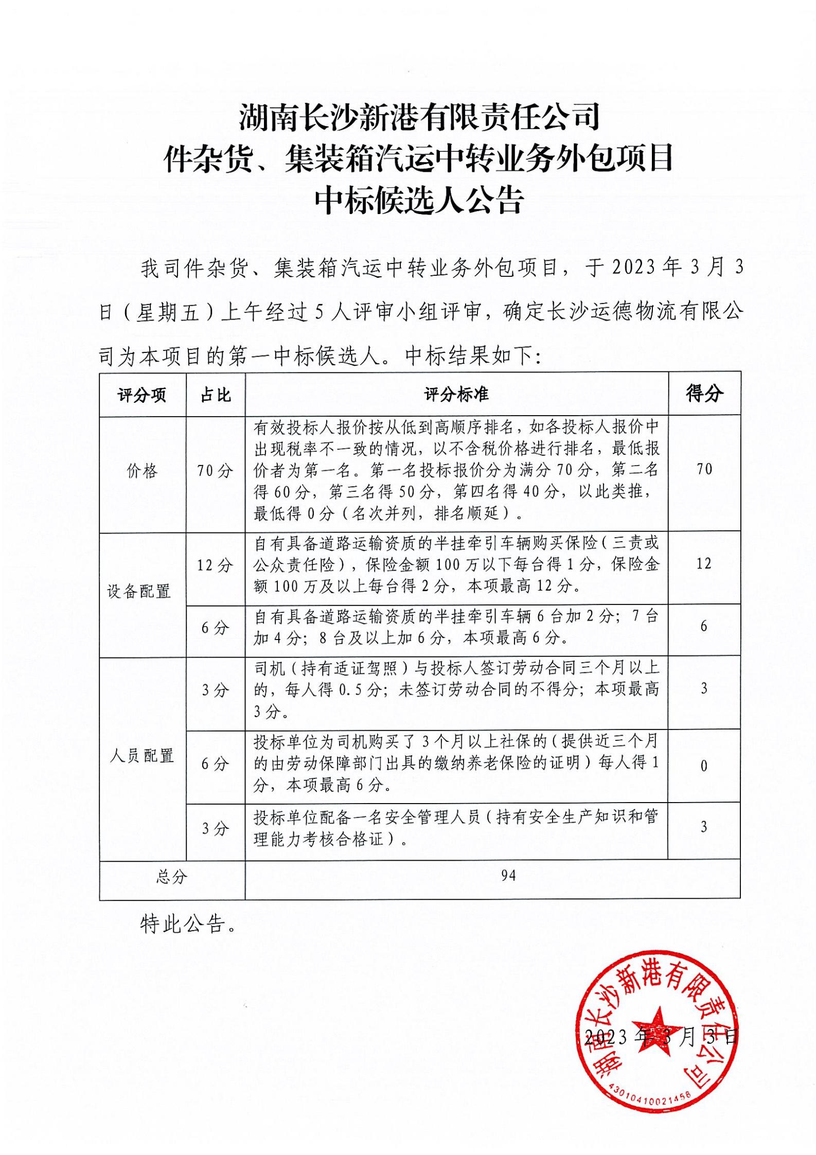 湖南長(cháng)沙新港有限責任公司件雜貨、集裝箱汽運中轉業(yè)務(wù)外包項目中標候選人公告