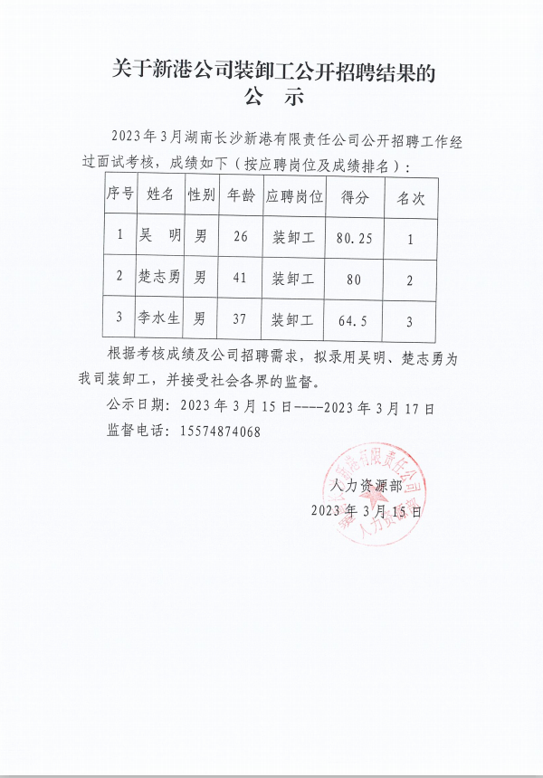 新港公司裝卸工公開(kāi)招聘結果的公示