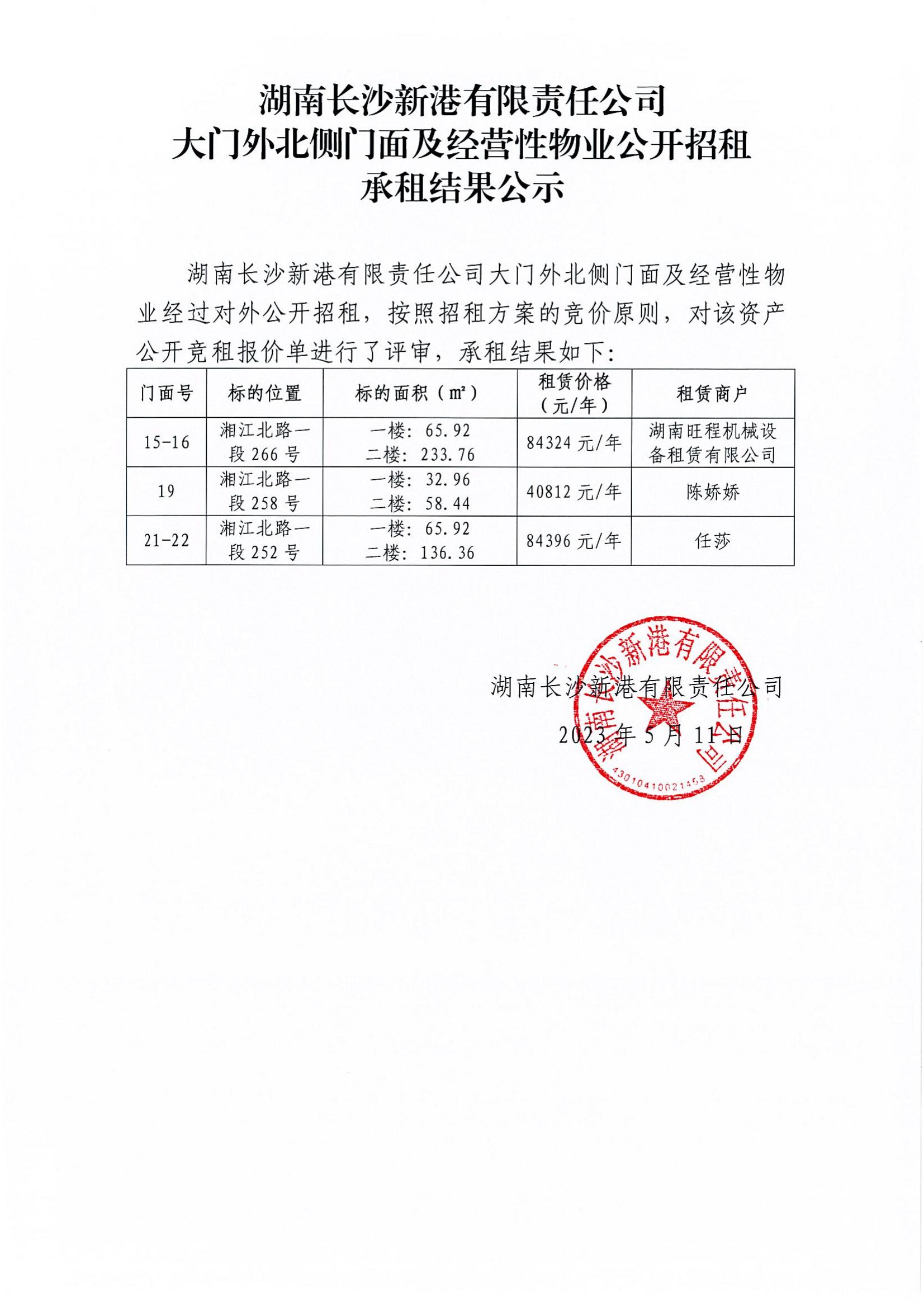 新港公司大門(mén)外北側門(mén)面及經(jīng)營(yíng)性物業(yè)公開(kāi)招租承租結果公示
