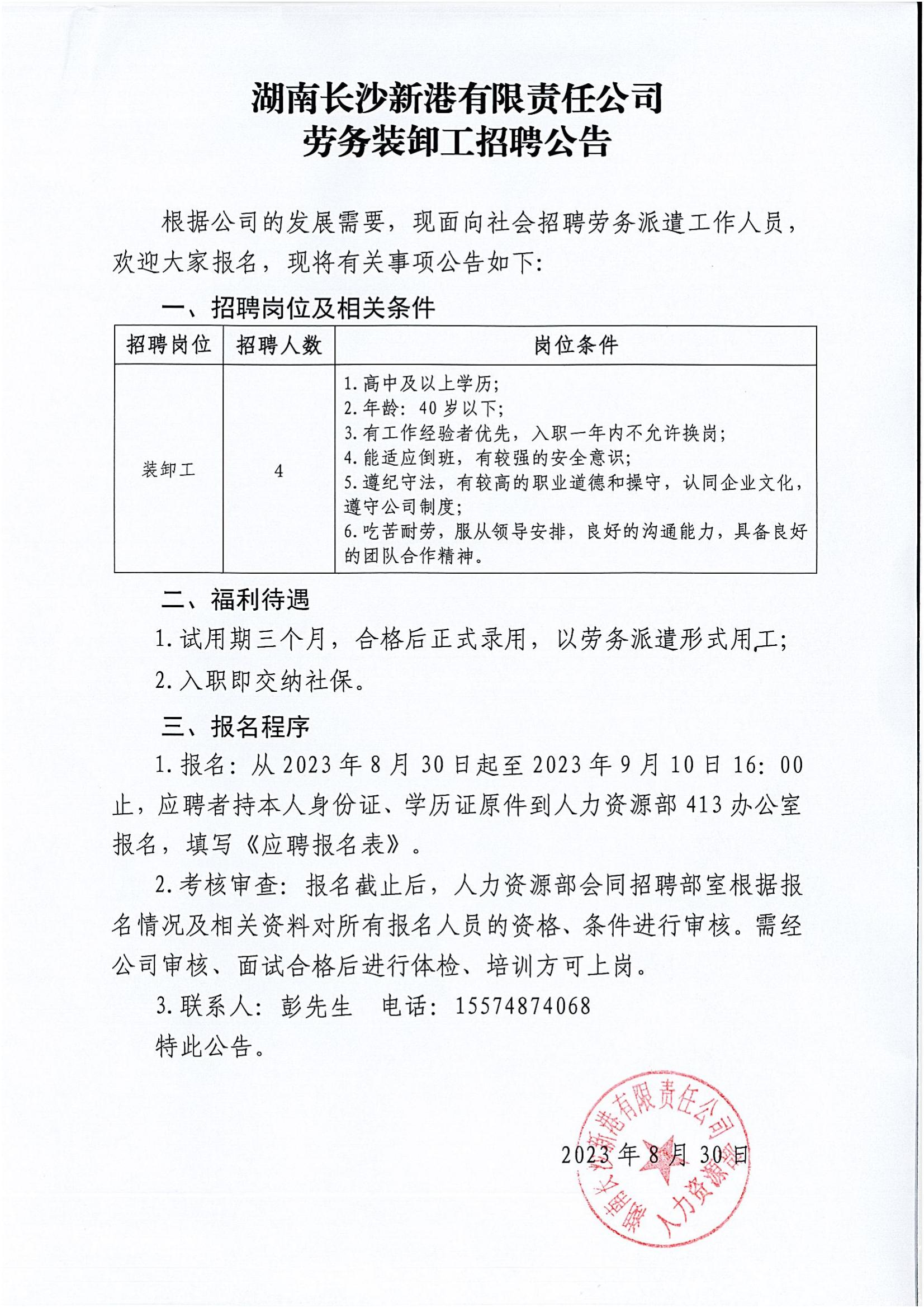 湖南長(cháng)沙新港有限責任公司勞務(wù)裝卸工招聘公告
