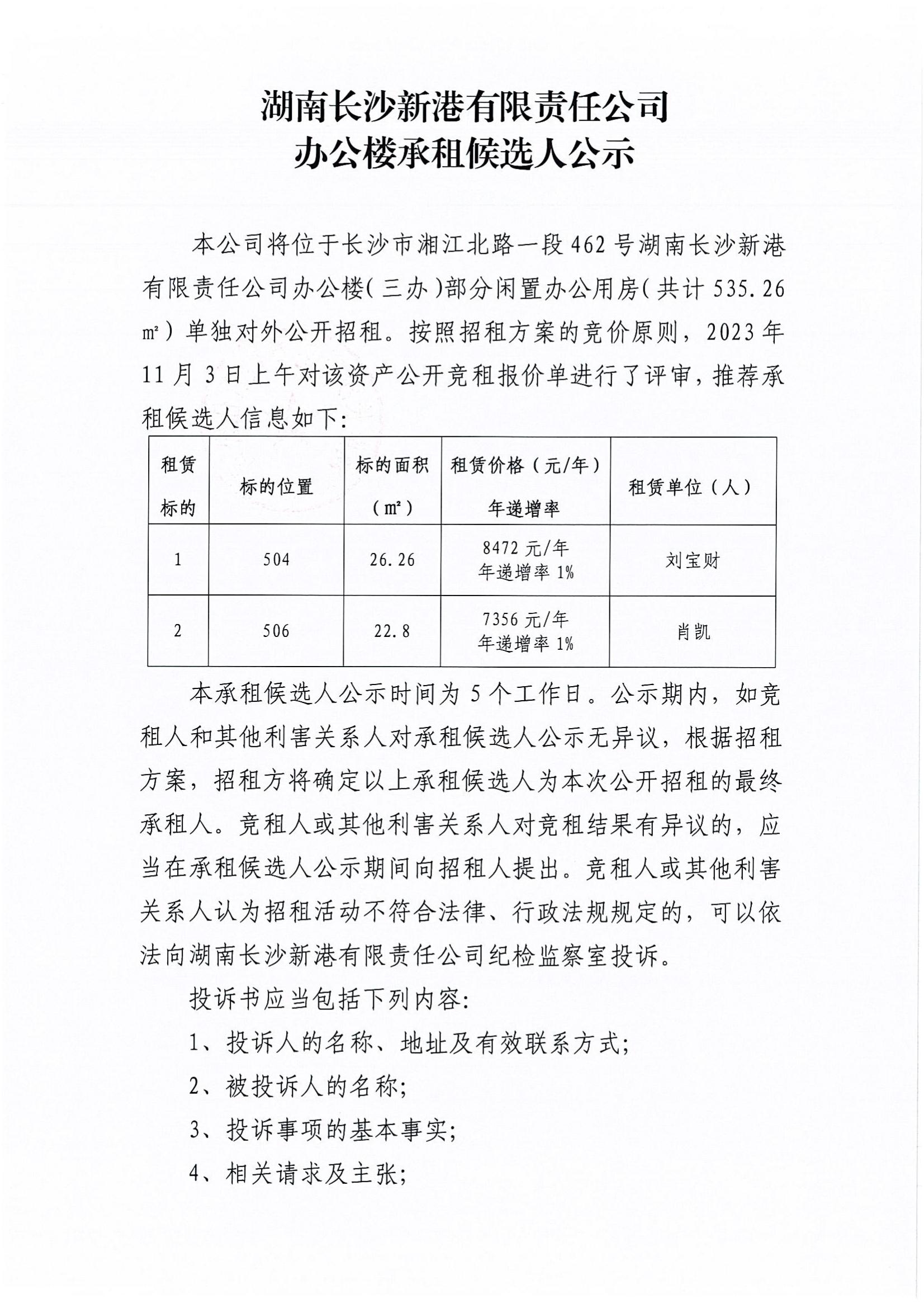湖南長(cháng)沙新港有限責任公司辦公樓承租候選人公示