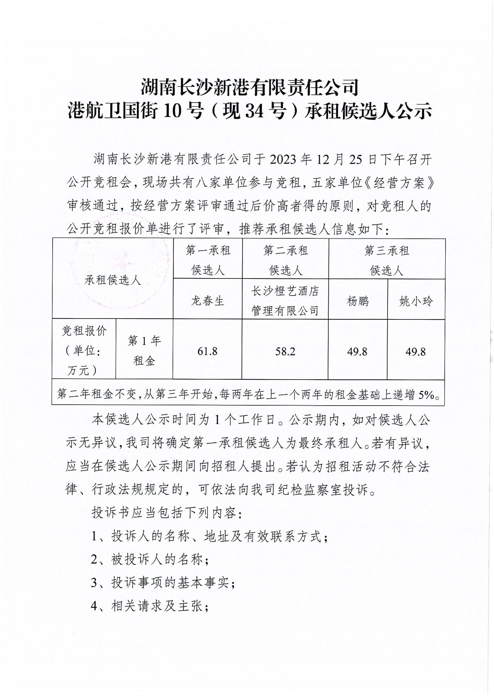 長(cháng)沙新港港航衛國街10號(現34號)承租候選人公示