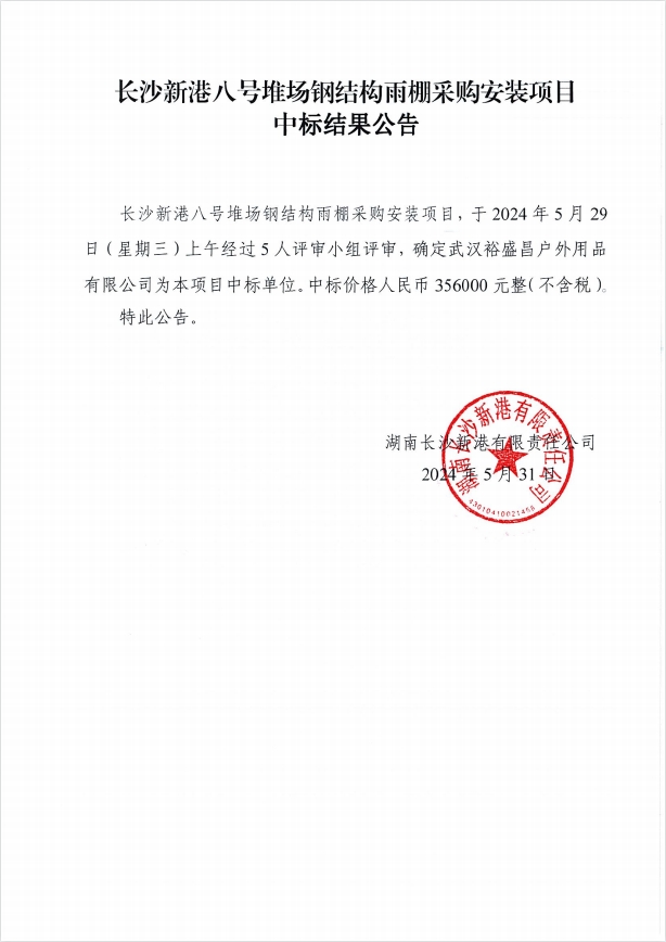長(cháng)沙新港八號堆場(chǎng)鋼結構雨棚采購安裝項目中標結果公示