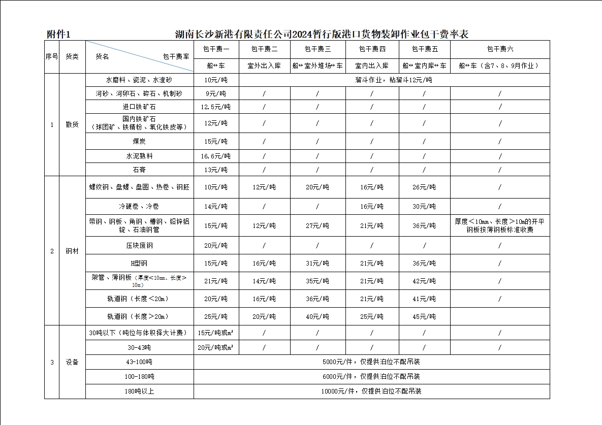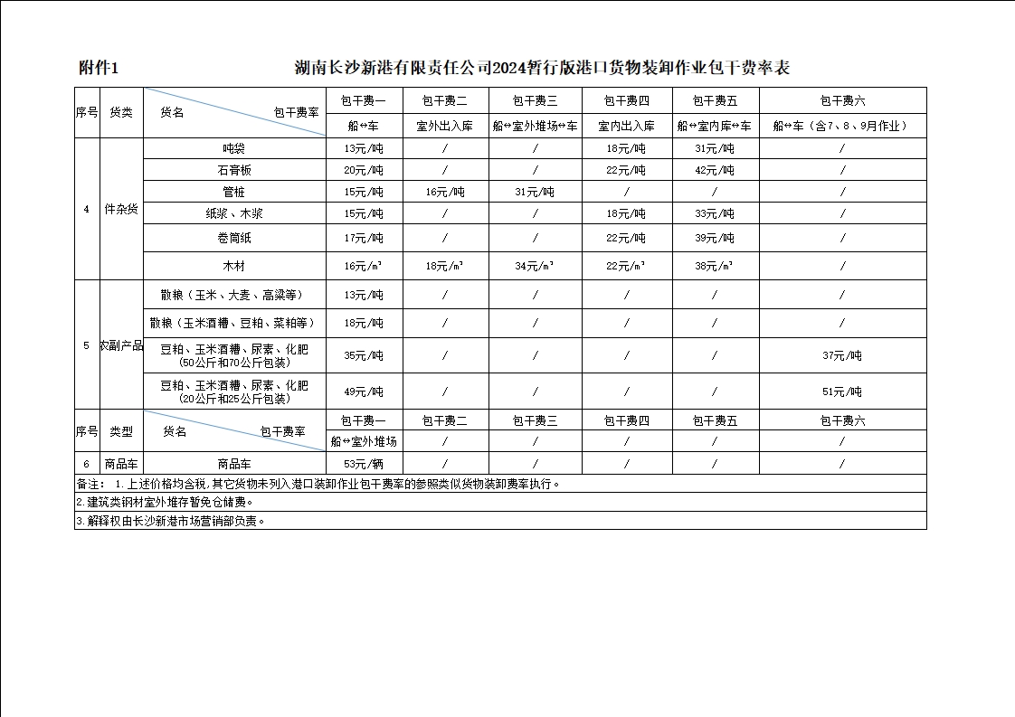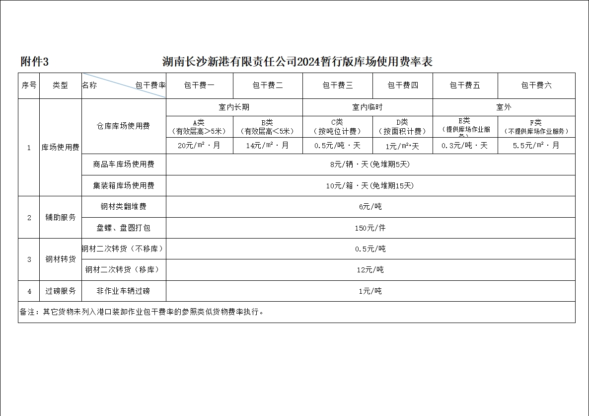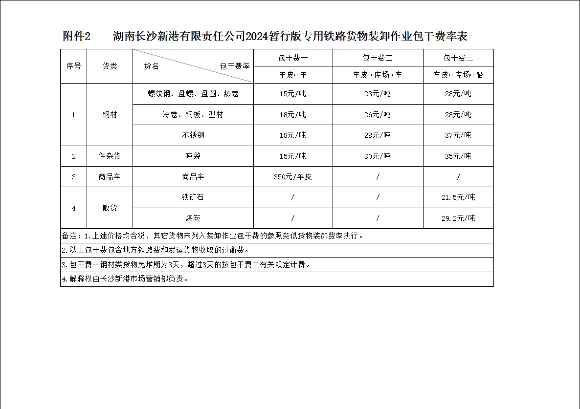 湖南長(cháng)沙新港有限責任公司2024暫行版港口貨物裝卸作業(yè)包干費率、2024暫行版專(zhuān)用鐵路貨物裝卸作業(yè)包干費率、2024暫行版庫場(chǎng)使用費率及2024暫行版裝卸作業(yè)包干費率階梯價(jià)格方案